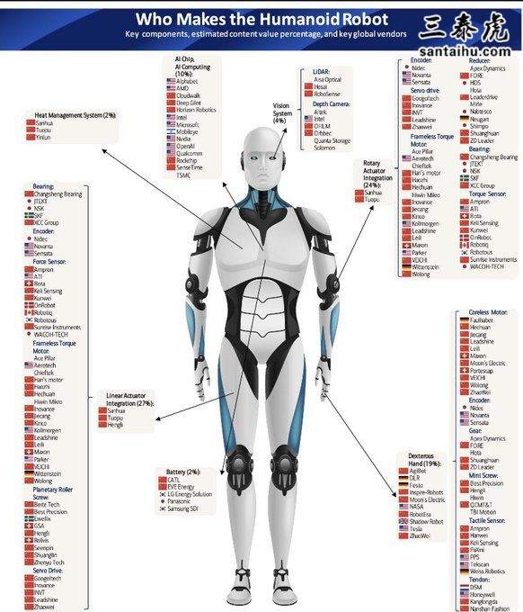 此文由 三泰虎 编辑,禁止转载,否则追求法律责任!:首页 > 专属 » 谁造了人形机器人!这是人形机器人的拆解图,各零件的产地,满屏是中国国旗,没有一面印度国旗