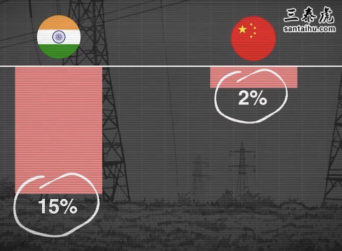 此文由 三泰虎 编辑,禁止转载,否则追求法律责任!:首页 > 专属 » 如图是中印的输配电损耗对比,印度的输配电损耗率高达15%,造成了沉重经济成本,中国仅2%,两国的损耗率相差太大了