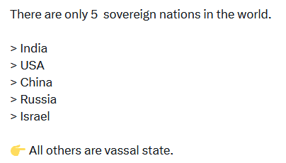 美国是以色列的附庸国,俄乌冲突后俄罗斯成了中国的附庸国,莫迪把印度变成了美国的附庸国,世界上真正主权独立的国家只有中国,其他全是附庸。把第一个印度去掉吧,它的决策都是华盛顿说了算。