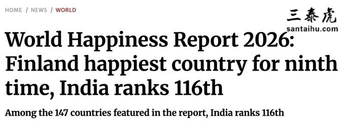 此文由 三泰虎 编辑,禁止转载,否则追求法律责任!:首页 > 专属 » 2026 年《世界幸福指数报告》发布,印度排名第116位,莫迪没能让我们幸福,他必须辞职,我们国家靠呼吸机勉强撑着,印网友:我去过中国,给人的感觉更幸福