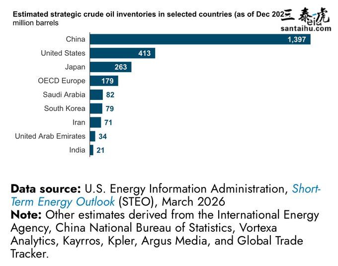 此文由 三泰虎 编辑,禁止转载,否则追求法律责任!:首页 > 专属 » 今日图表:中国真实的战略石油储备规模惊人——超过美国、日本与整个西欧的总和,比后面的国家全部加起来都多,印度垫底