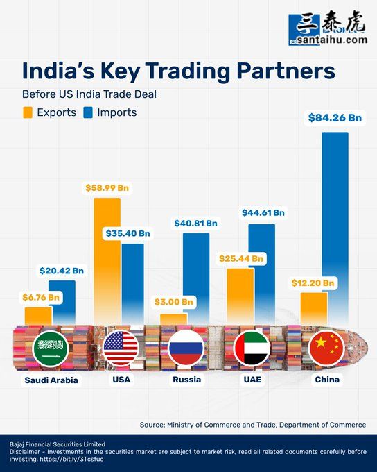中国仍是印度最重要的贸易伙伴。印度从中国的进口额,比从美国+俄罗斯加起来还多。