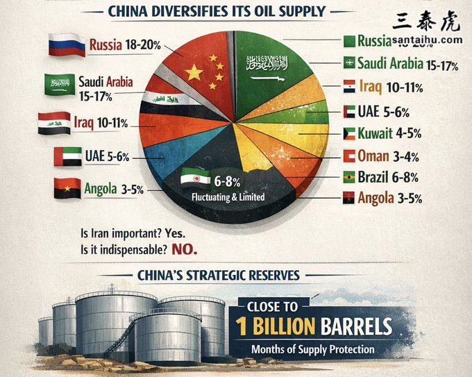 这个数据太老了。2022到2023年起,中国大幅减少从伊朗进口石油。现在伊朗在中国石油进口中的占比可能还不到1%。